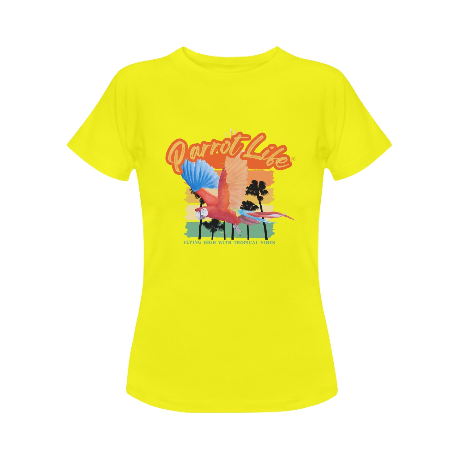 Parrot Life - Flying High with Tropical Vibes. 100% Cotton. Made of preshrunk ring -spun cotton. Double-bevelled collar edges (1X1 ribbing) with heat transfer vinyl printing technology. A collar neckband makes for a comfortable fit. Double-thread seems on its cuffs and hem.